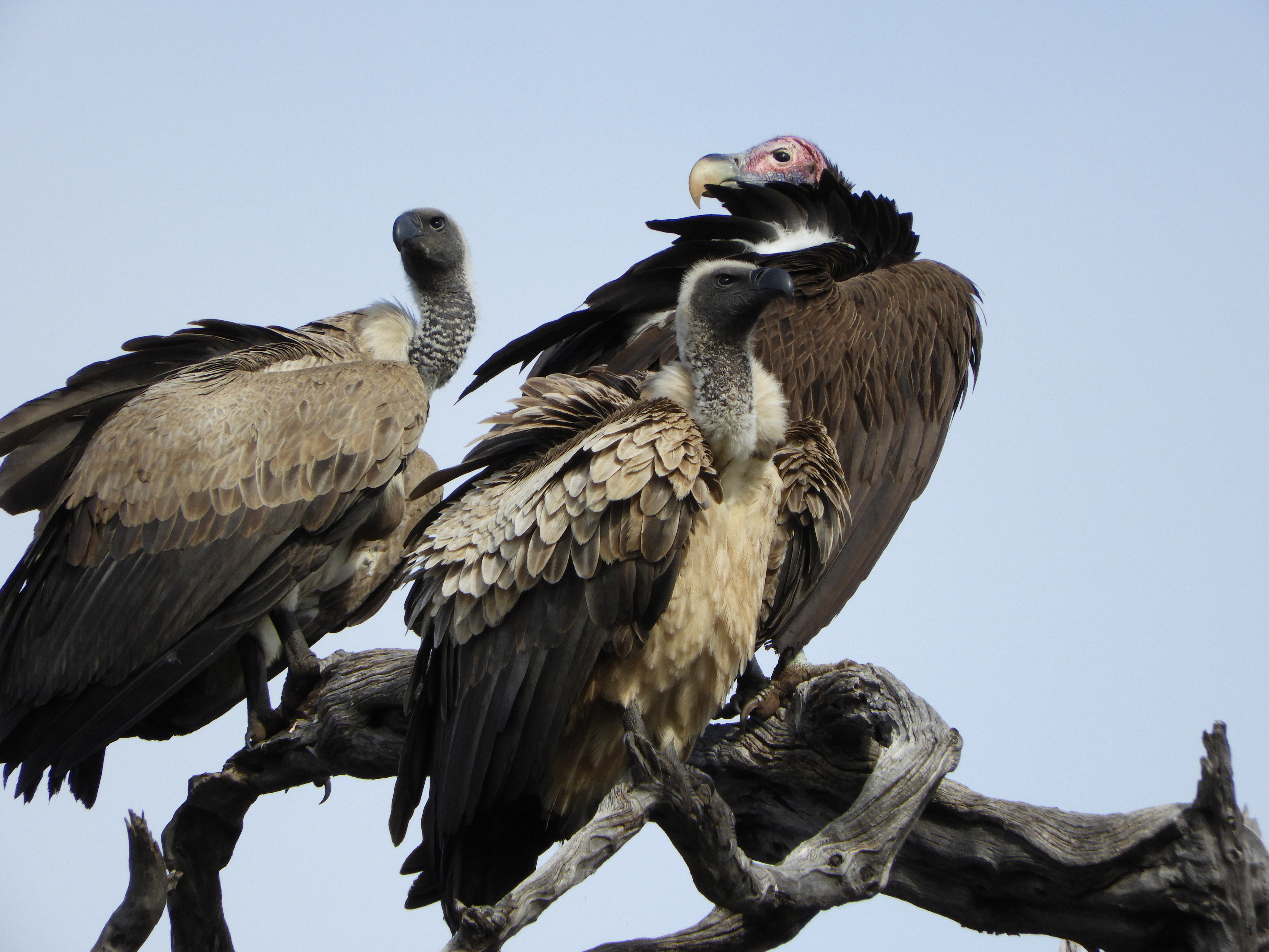 Two white-backed vultures and a hooded vulture