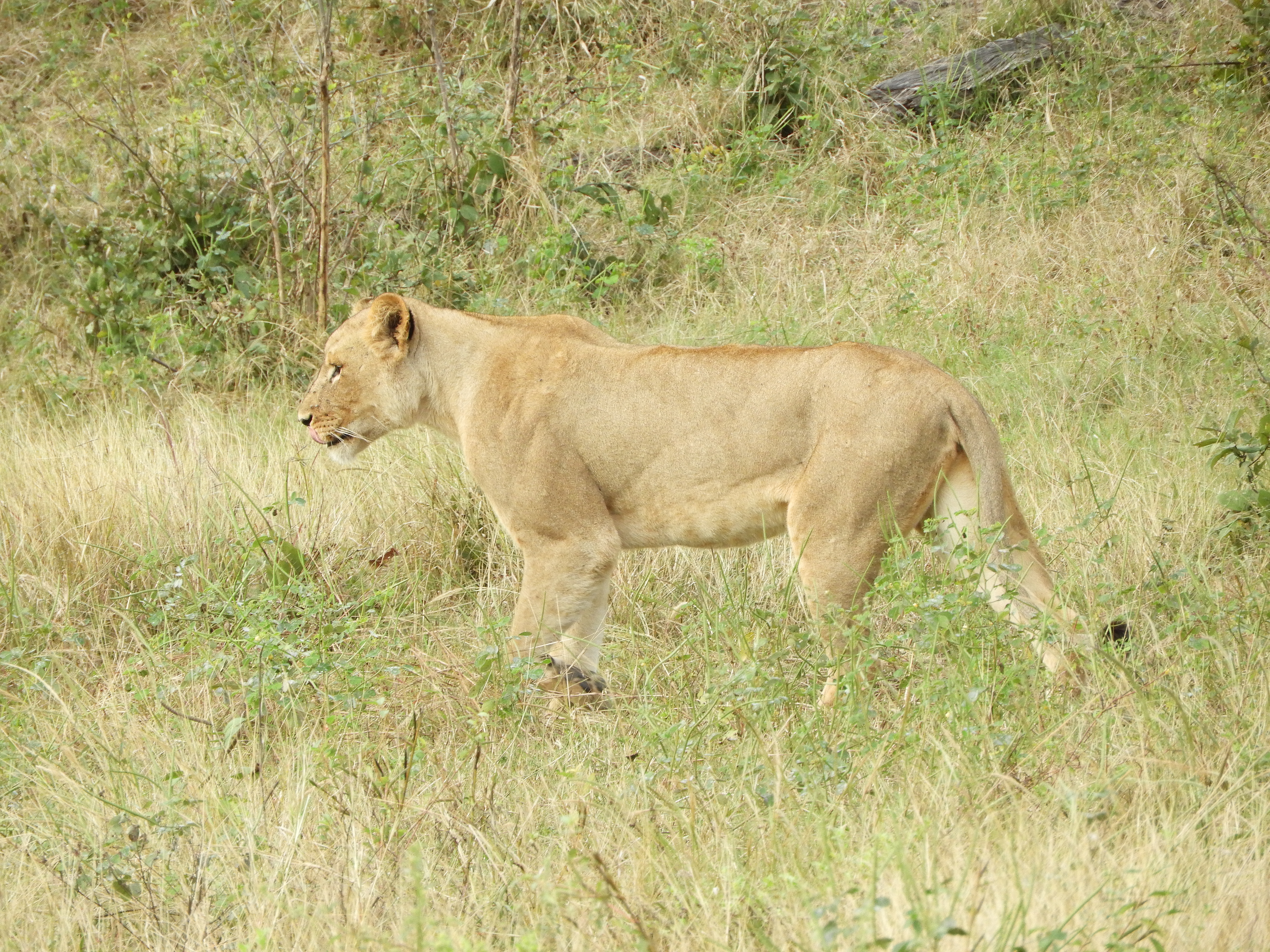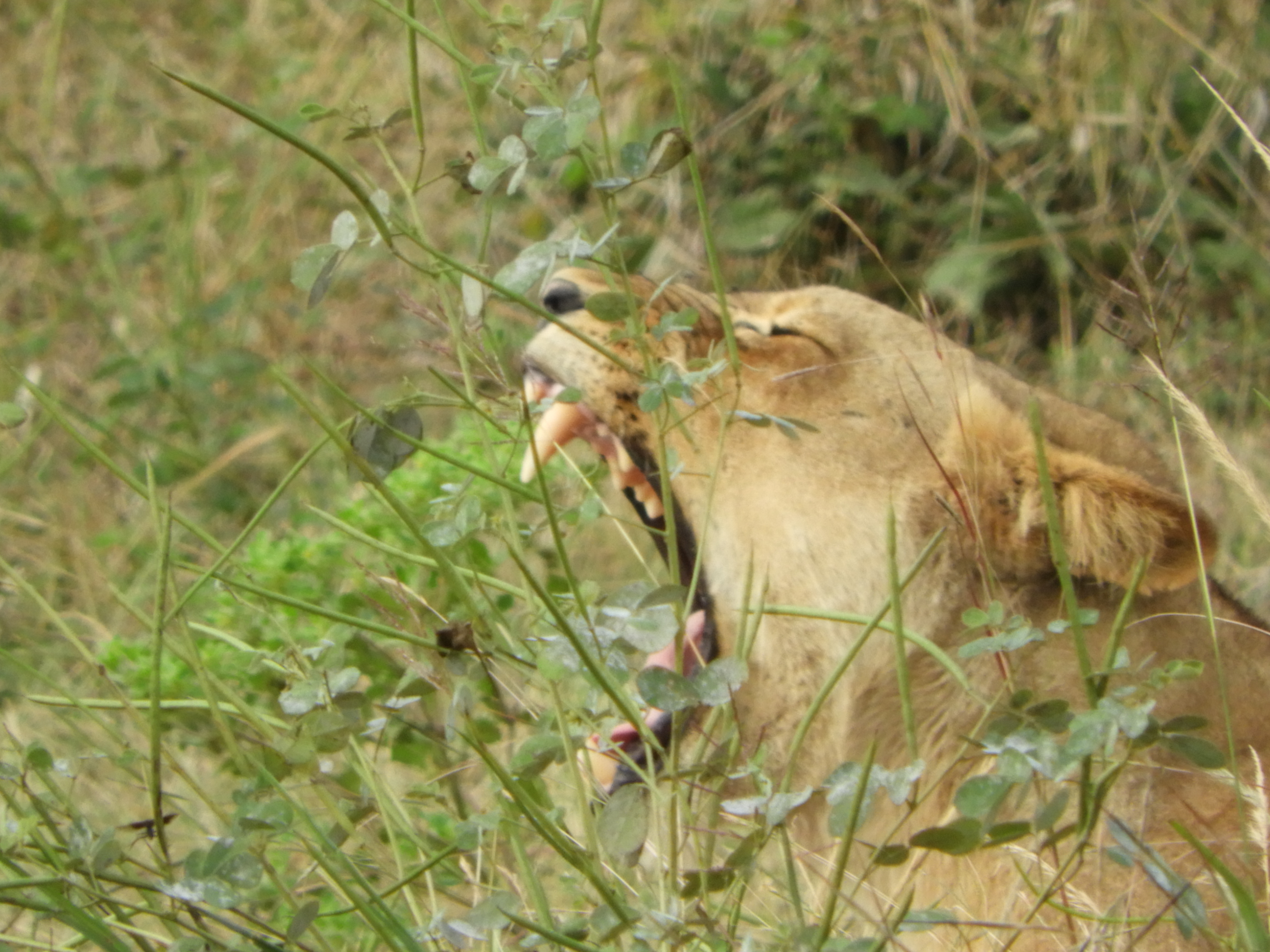 Another lioness waiting in the grass - nice teeth!