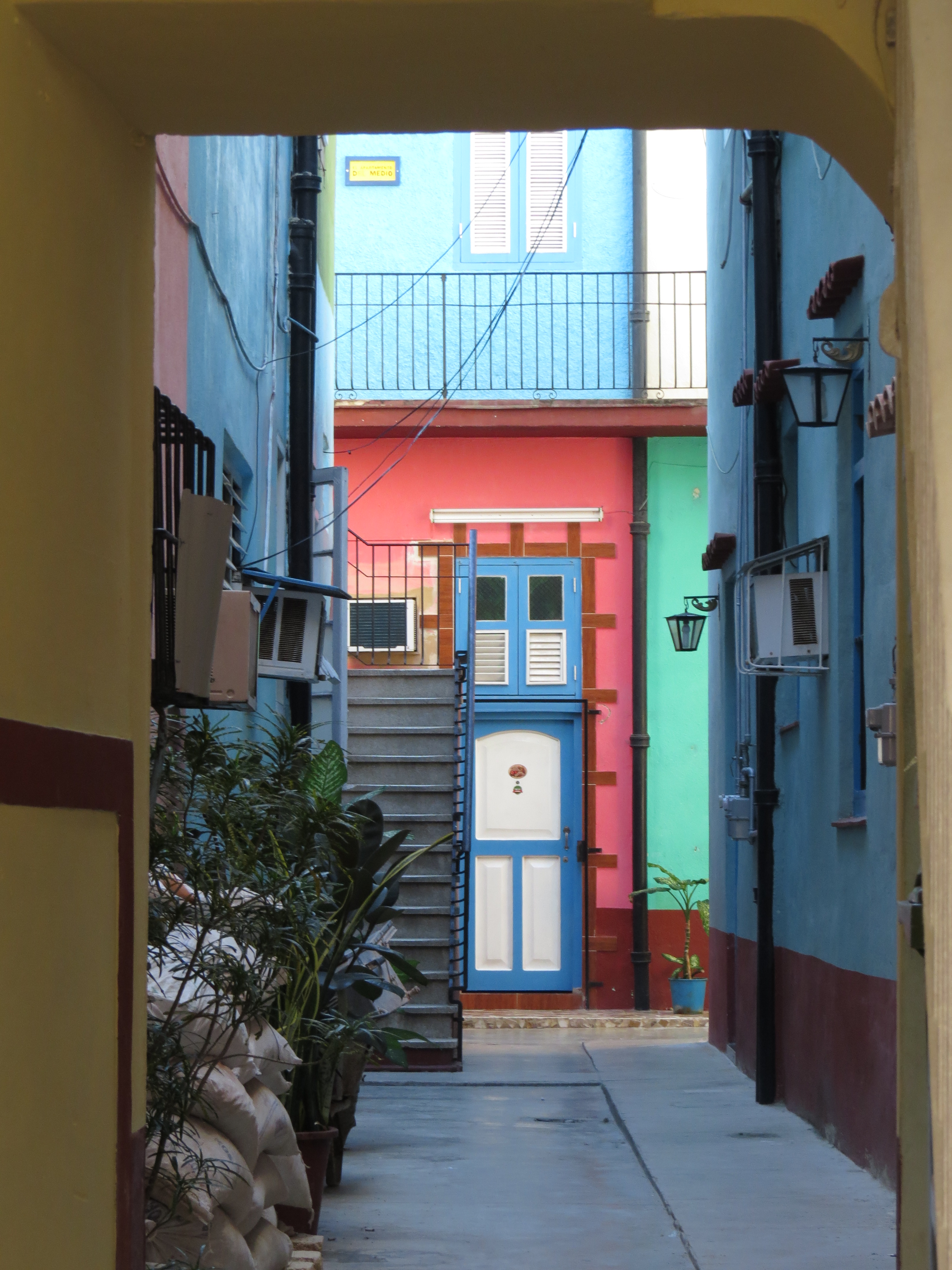 A view down an entryway. Many of the buildings were painted bright colors like this.