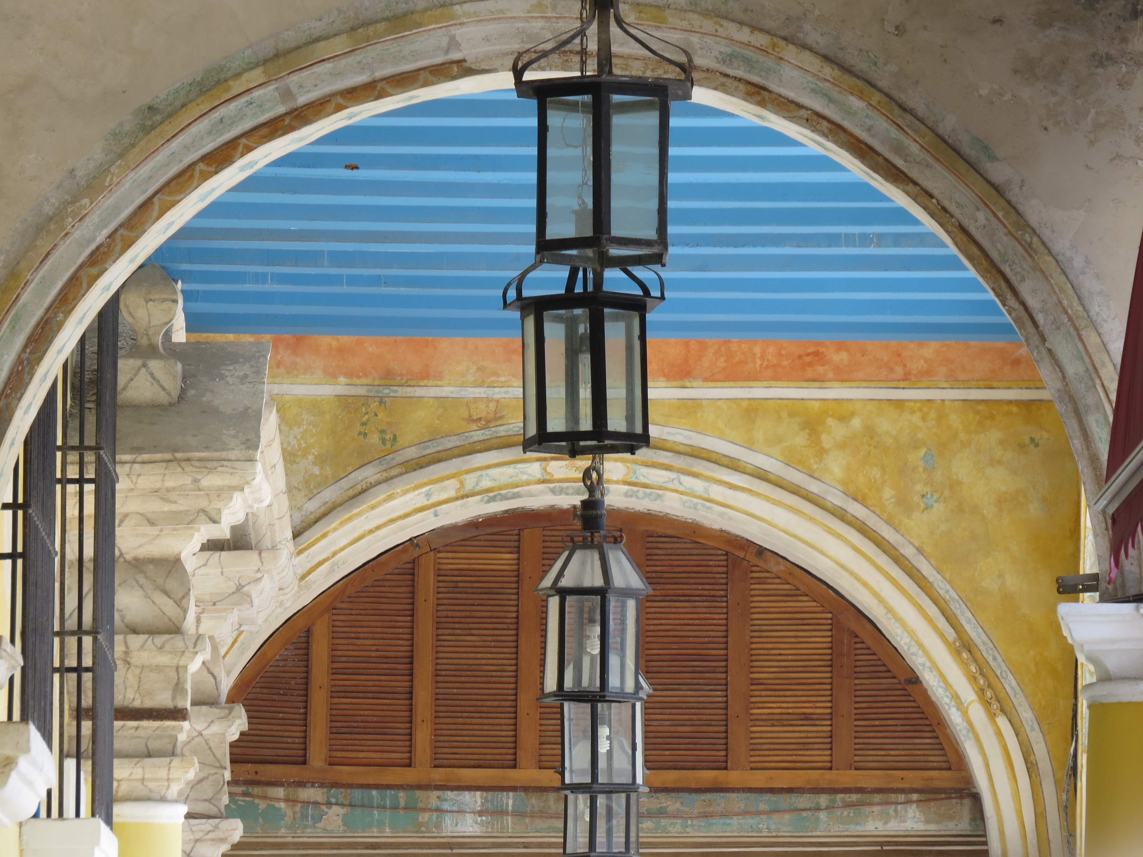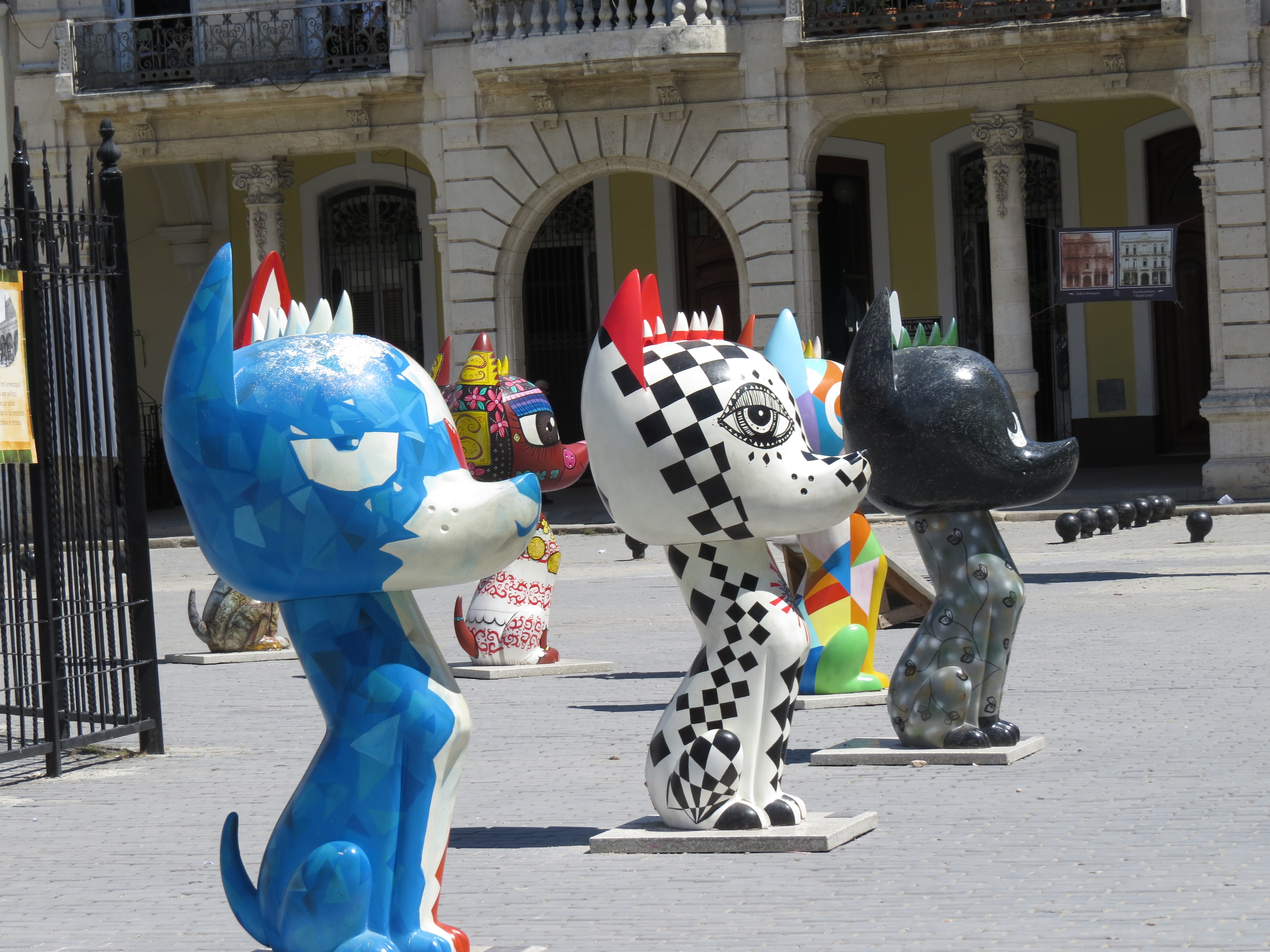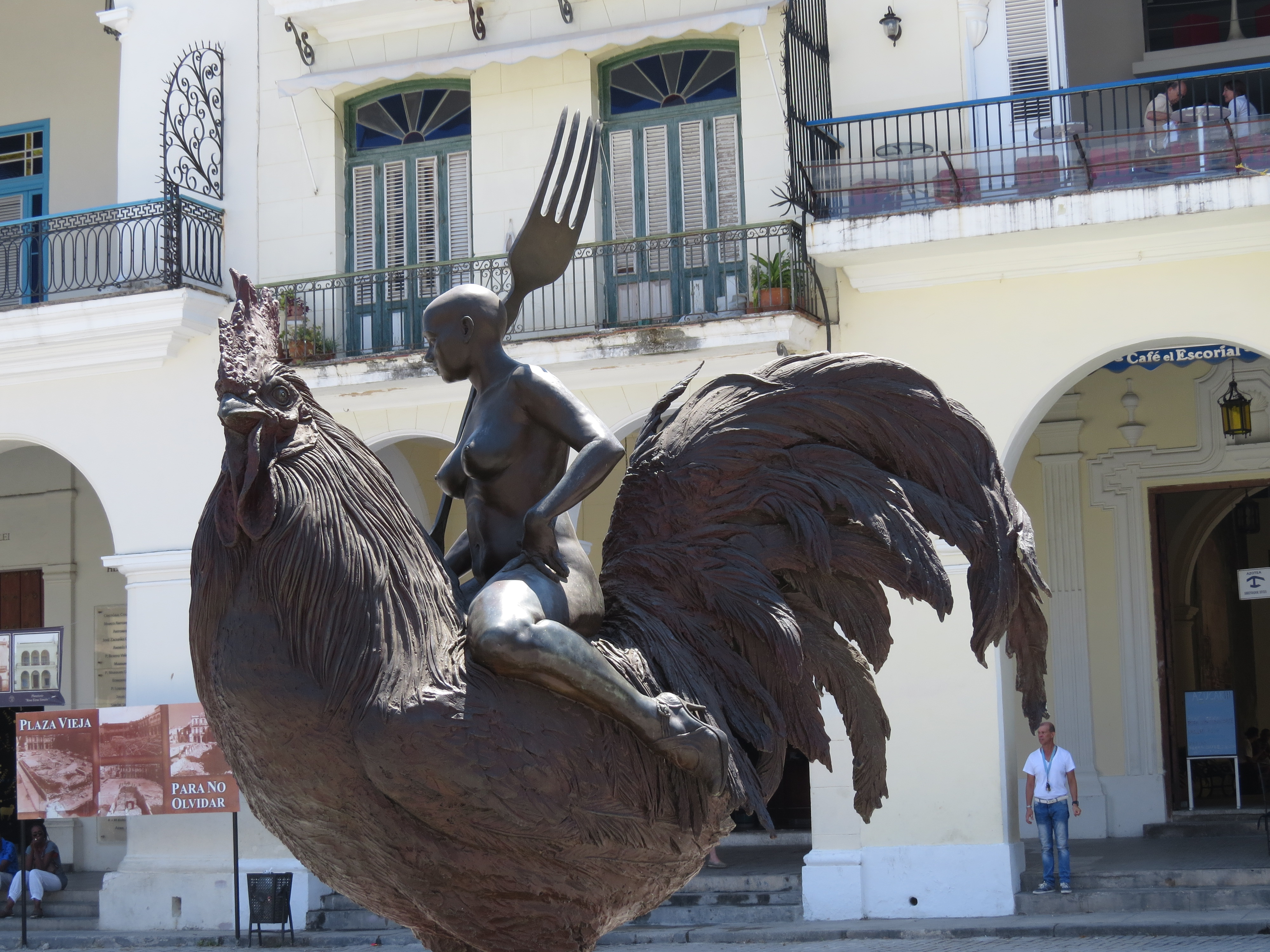 A sculpture in New Square. During the "special period" in Cuba, after the fall of the Soviet Union, raising chickens was recommended as an inexpensive food source. The sculpture depicts a woman with a "pet chicken", and a fork for when she eats the chicken.
