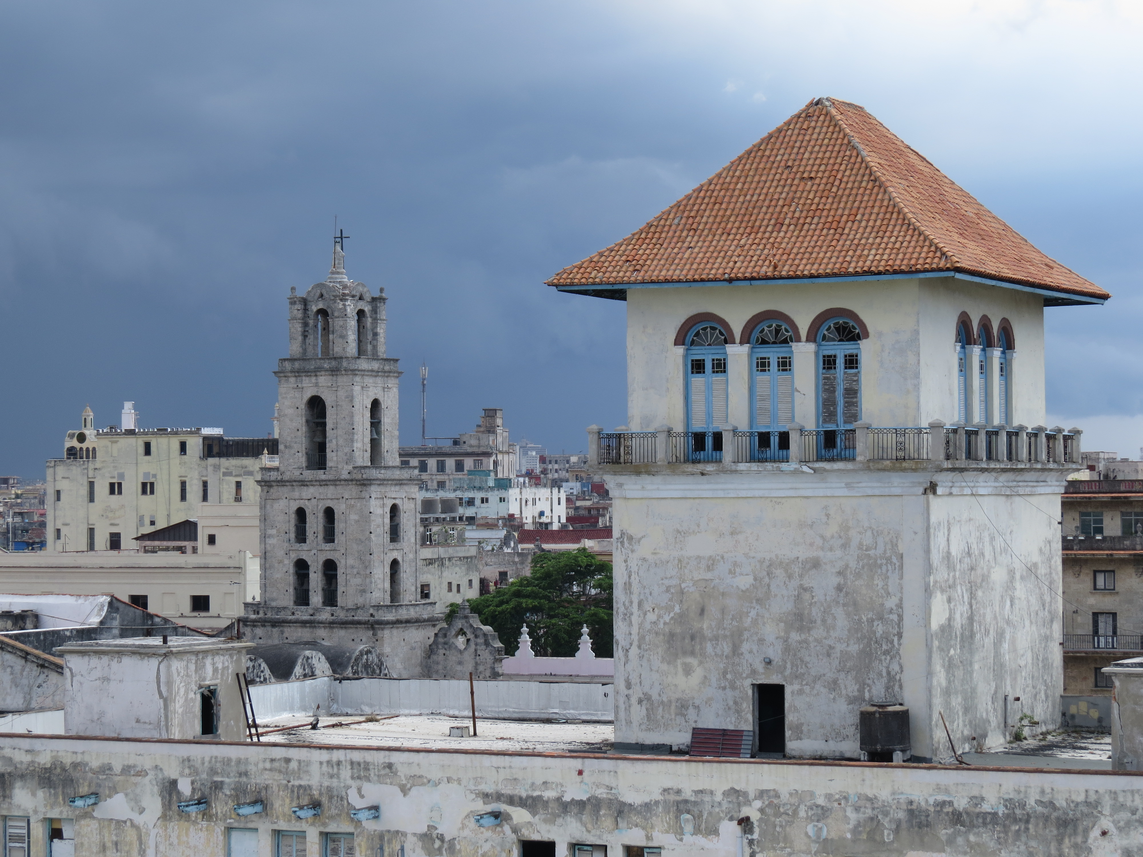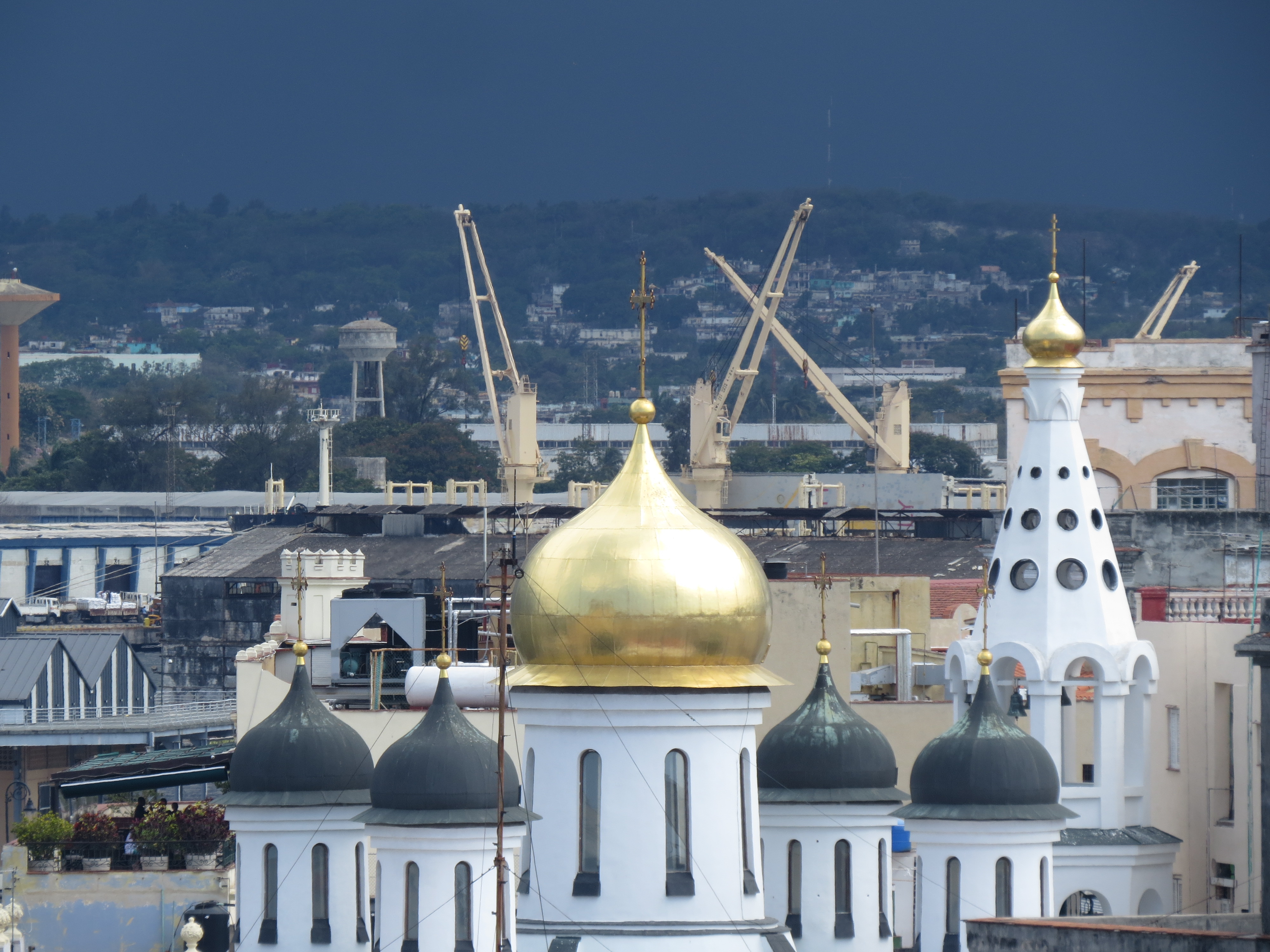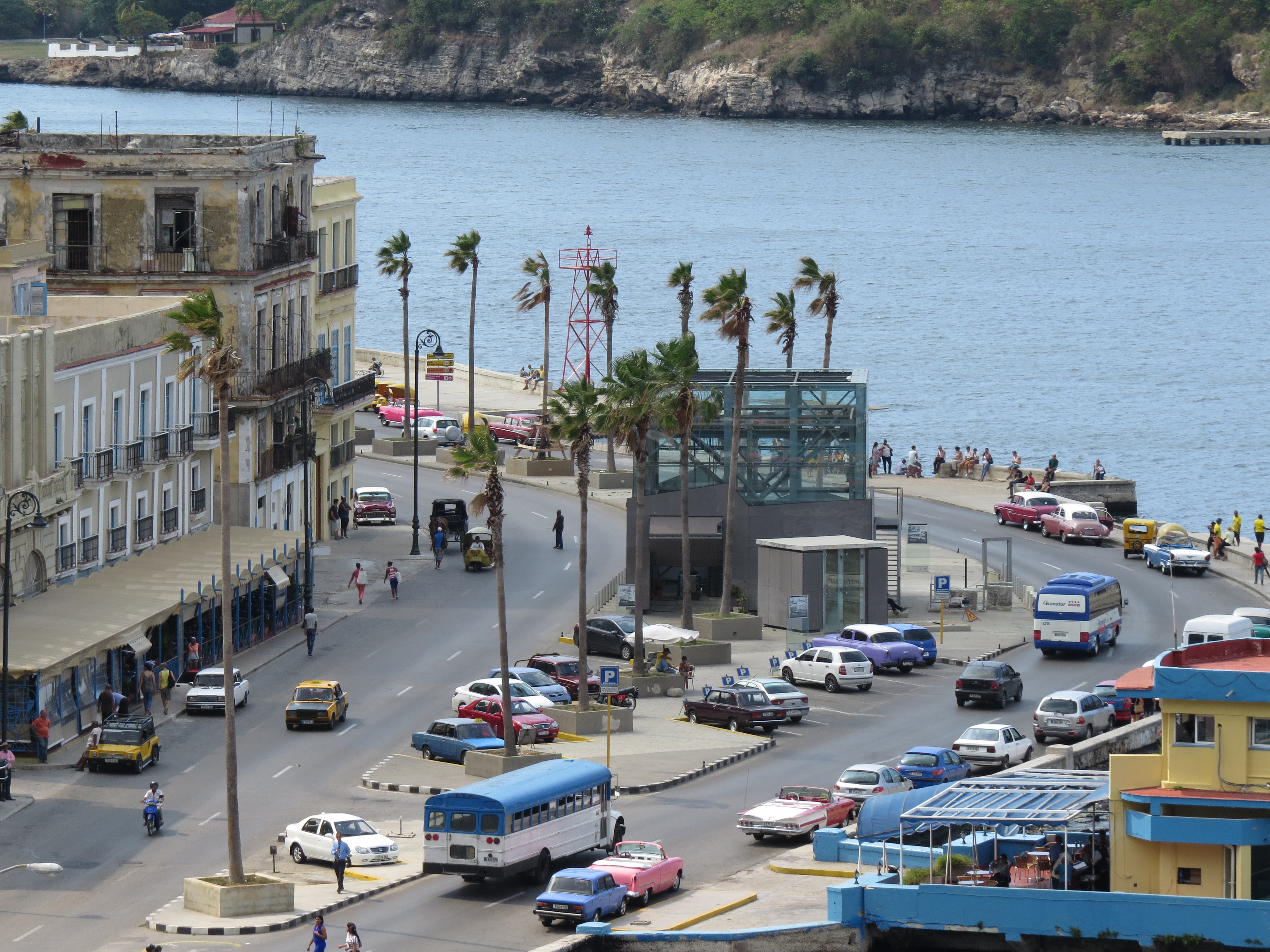 A main road that goes along the harbor entrance. The wall along the water is a popular gathering spot for young people on weekend evenings. Note the old cars on the street.