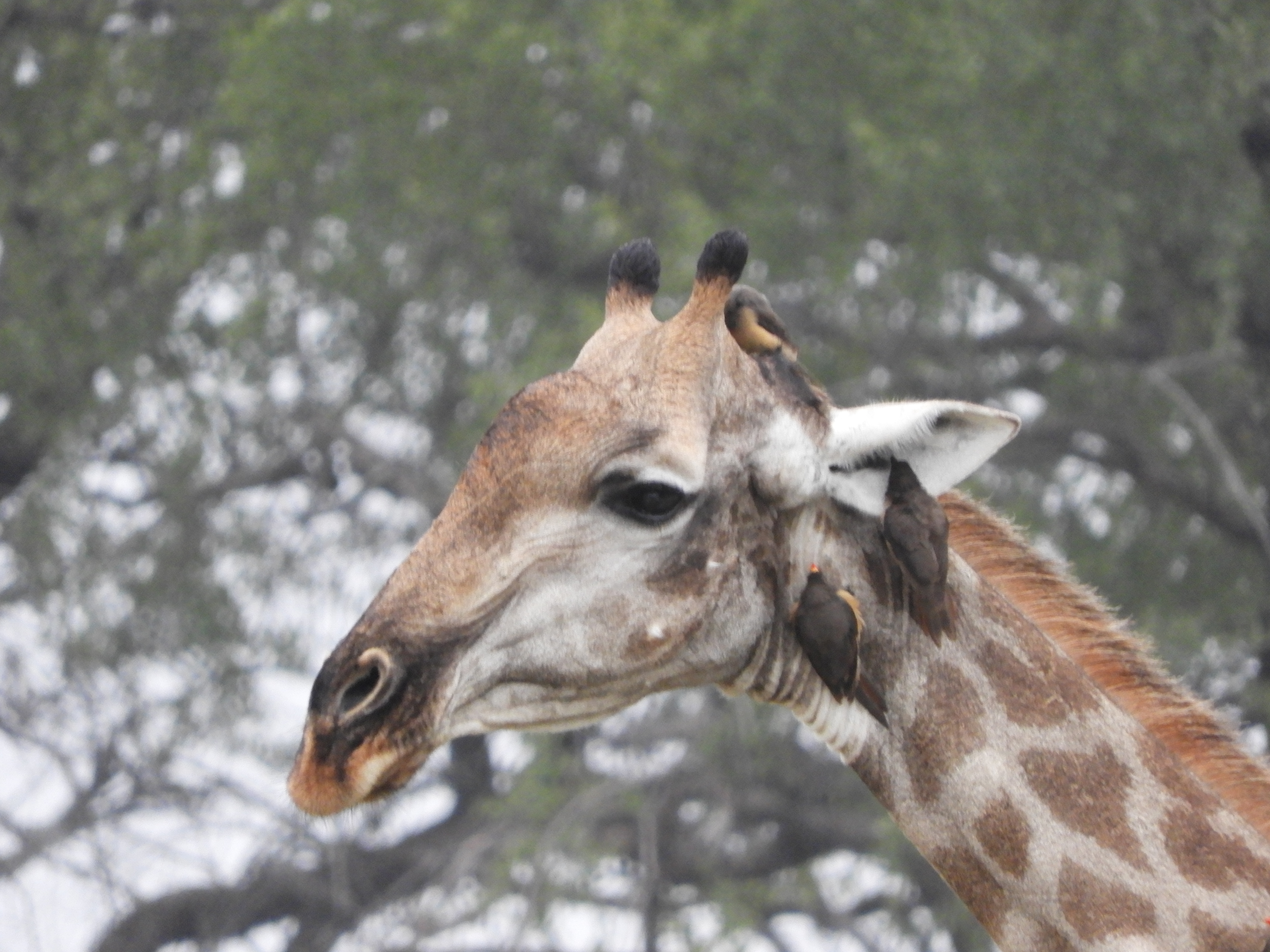 The oxpeckers like bugs on giraffes, too