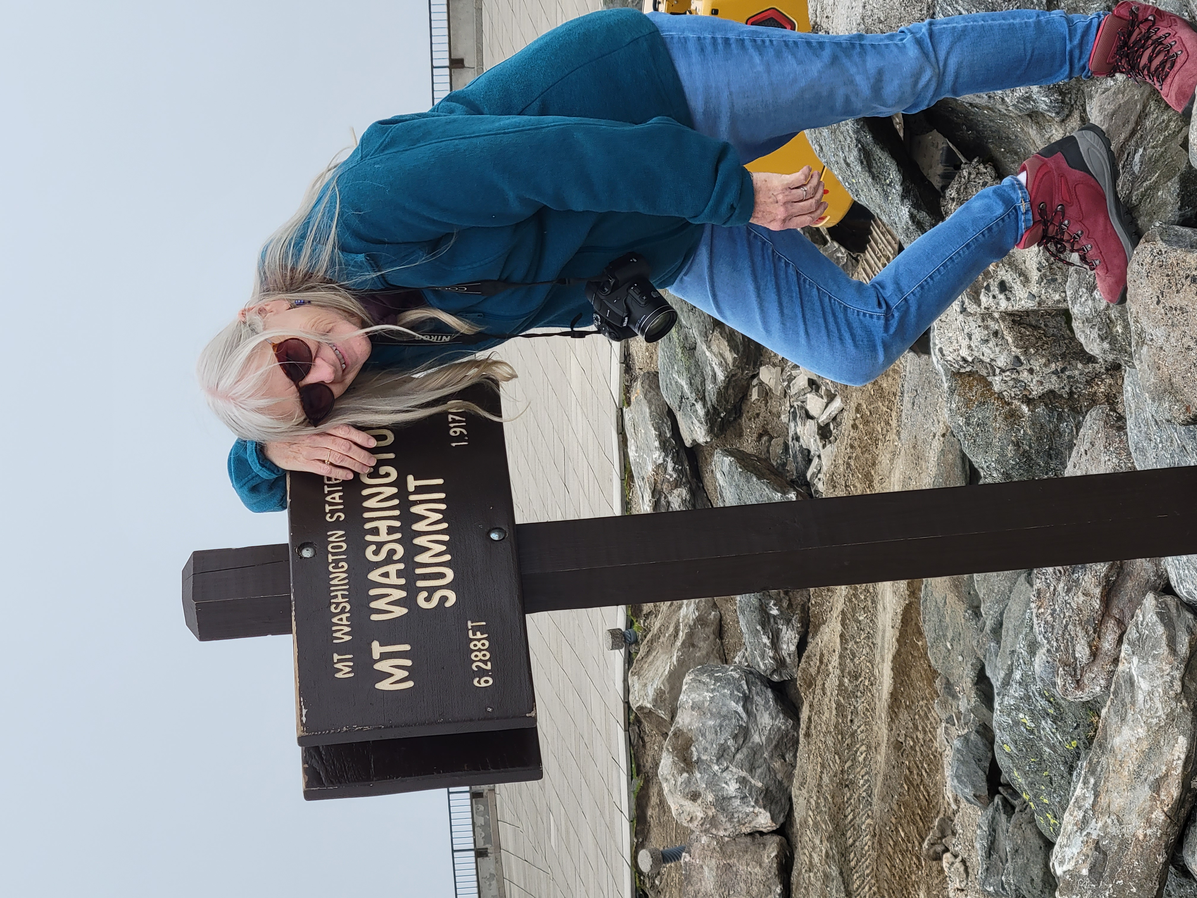 Kay is exhausted after reaching the peak of Mt Washington. Imagine how tired